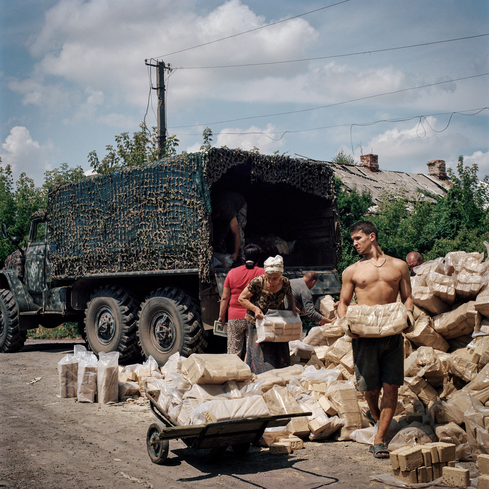 Українські солдати допомагають Лебедєвим та іншим селянам збирати брикети з тирси, доставлені Червоним Хрестом в Опитному — Анастасія Тейлор