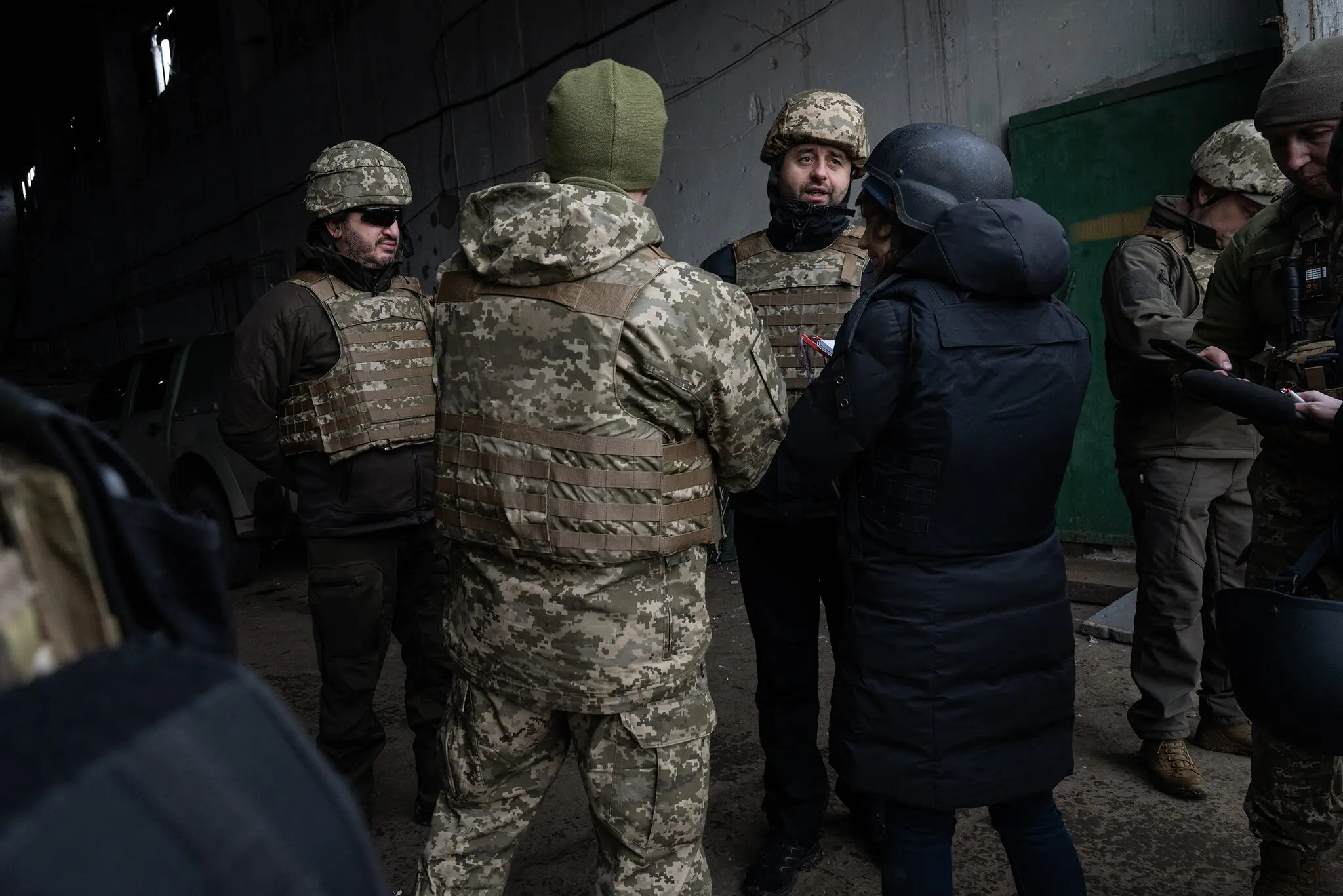 Давид Арахамія, праворуч у центрі, помічник президента України Володимира Зеленського, поблизу лінії фронту на сході України у лютому 2022 року. Пан Козак намагався домовитися з ним про припинення вогню, повідомляють люди, знайомі з подіями — Лінсі Аддаріо