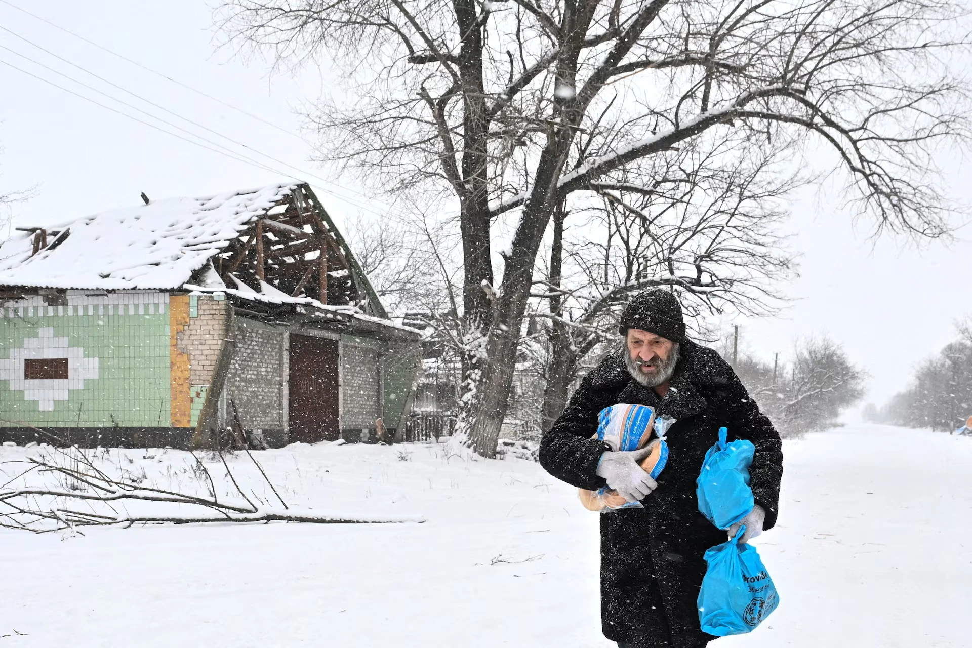Мешканець несе їжу, доставлену українськими поліцейськими, у прифронтовому селі Долинка, Запорізька область, Україна, на тлі нападу Росії на Україну, 16 січня 2026 року — Stringer