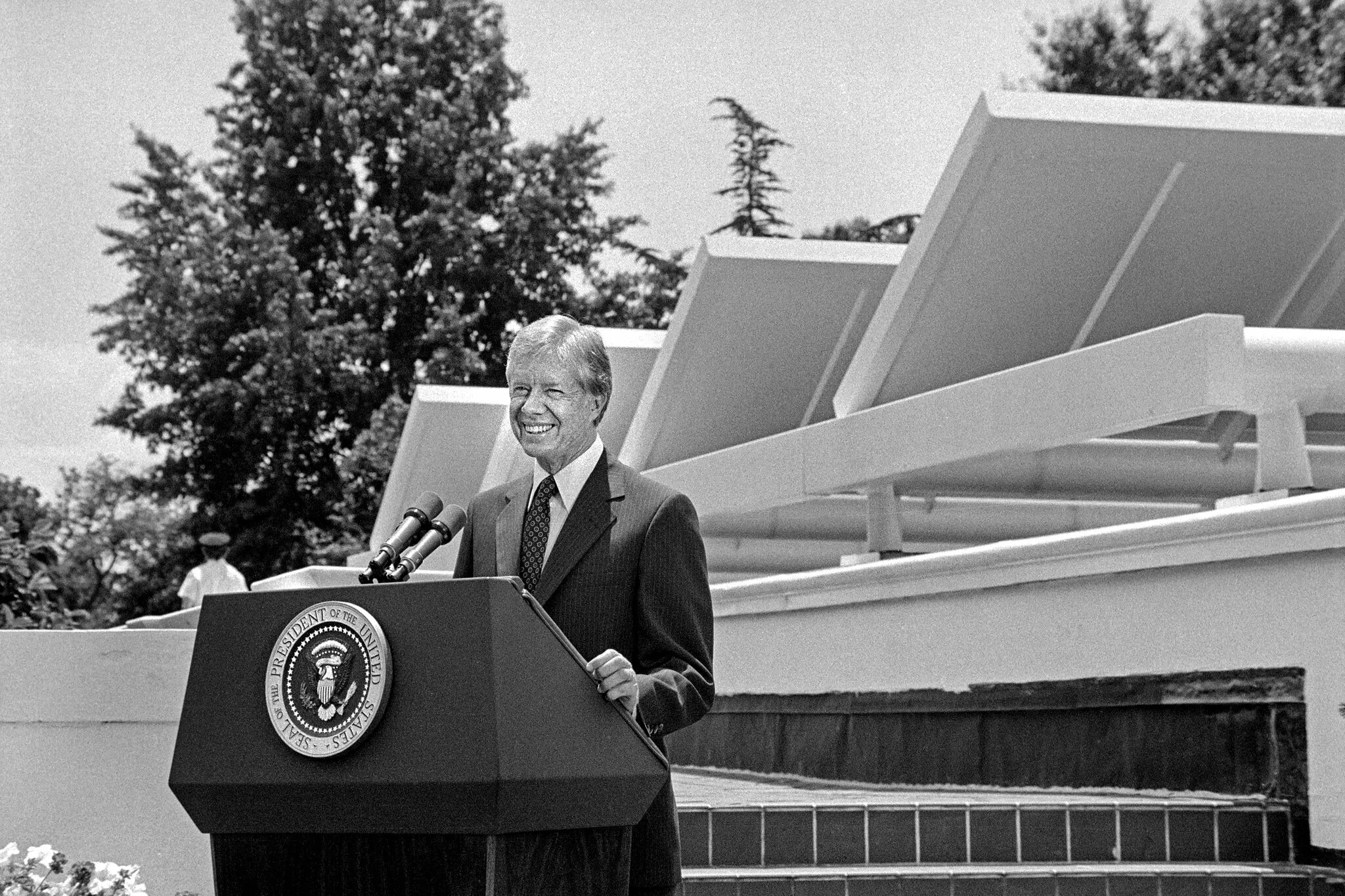 Президент Джиммі Картер на заході на даху Білого дому в 1979 році після того, як там були встановлені сонячні панелі позаду нього. — Universal Images Group, через Getty Images