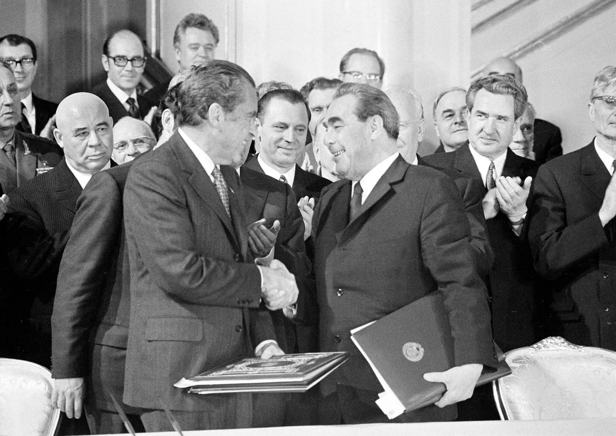 Президент Річард Ніксон потискає руку Леоніду Брежнєву, лідеру Росії, після підписання угоди про обмеження стратегічних наступальних озброєнь у Москві в 1972 році — Архівне фото через газету Дейком