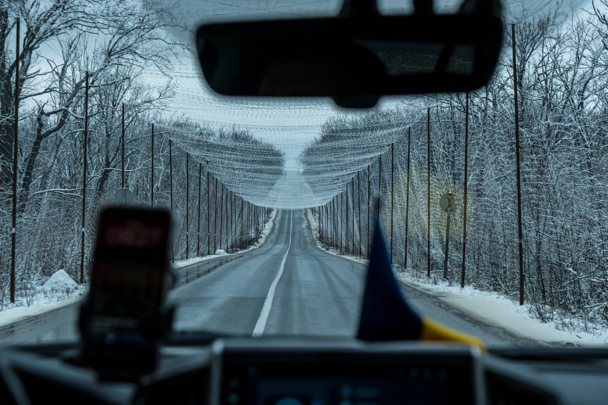 Сітка над дорогою в Україні, яка використовується для захисту транспортних засобів від російських дронів — Брендан Гоффман