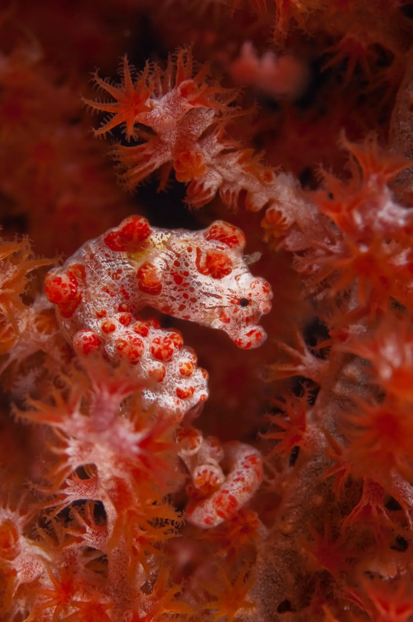 Пігмейський морський коник — рибка завдовжки близько дюйма, що живе на віялоподібних, горбкуватих коралах у Тихому океані. Його колір і текстура тіла феноменально збігаються з «господарем»: рожеві чи жовті коники повторюють не лише відтінок, а й ритм і розмір коралових горбків. Таке маскування ховає від хижаків, а природна стійкість до отрути поліпів дозволяє жити прямо на жалких гілках.