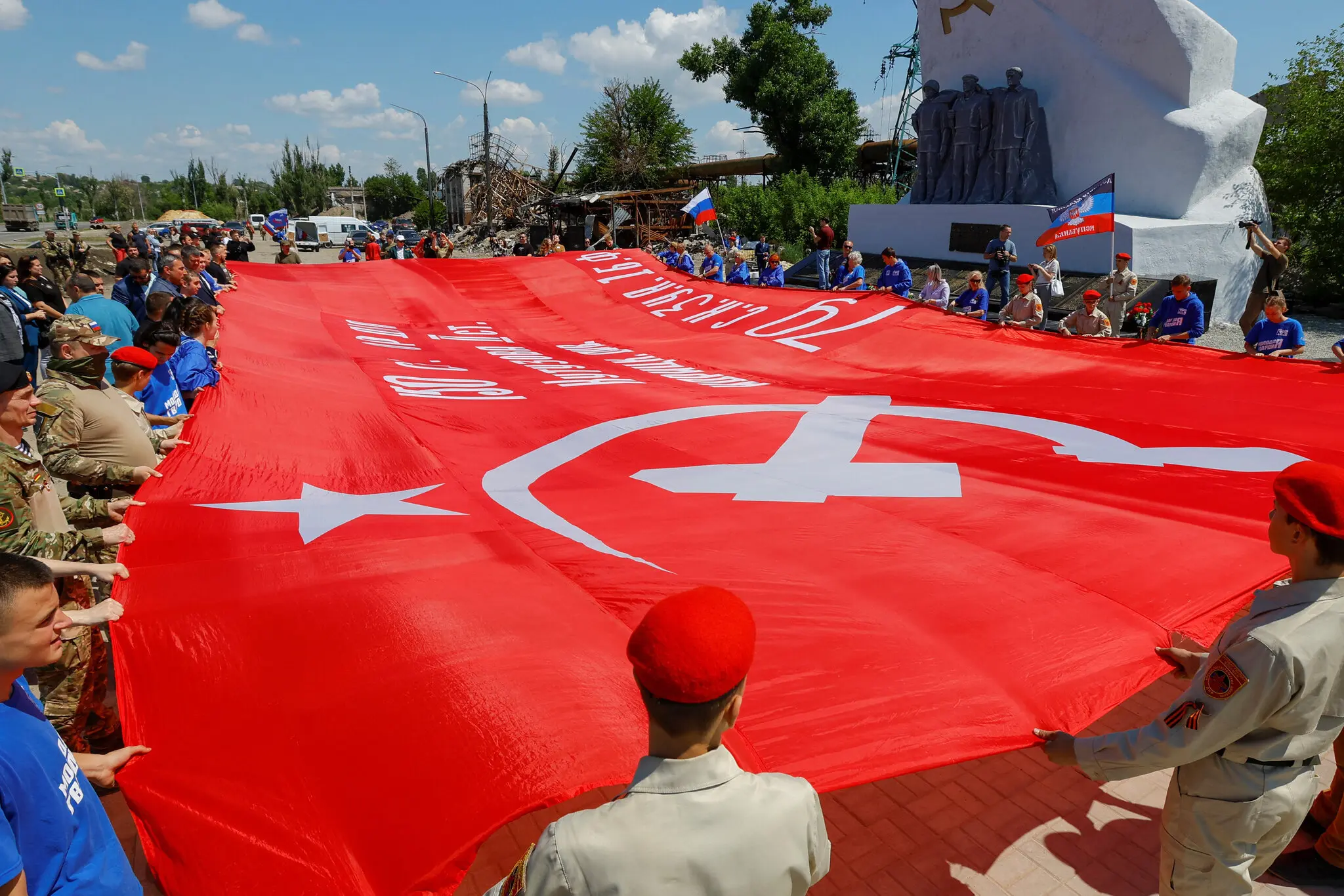 Церемонія з нагоди другої річниці захоплення російськими військами Маріуполя, біля відреставрованого меморіалу Другої світової війни біля заводу «Азовсталь», травень 2024 року — Олександр Єрмоченко/Reuters
