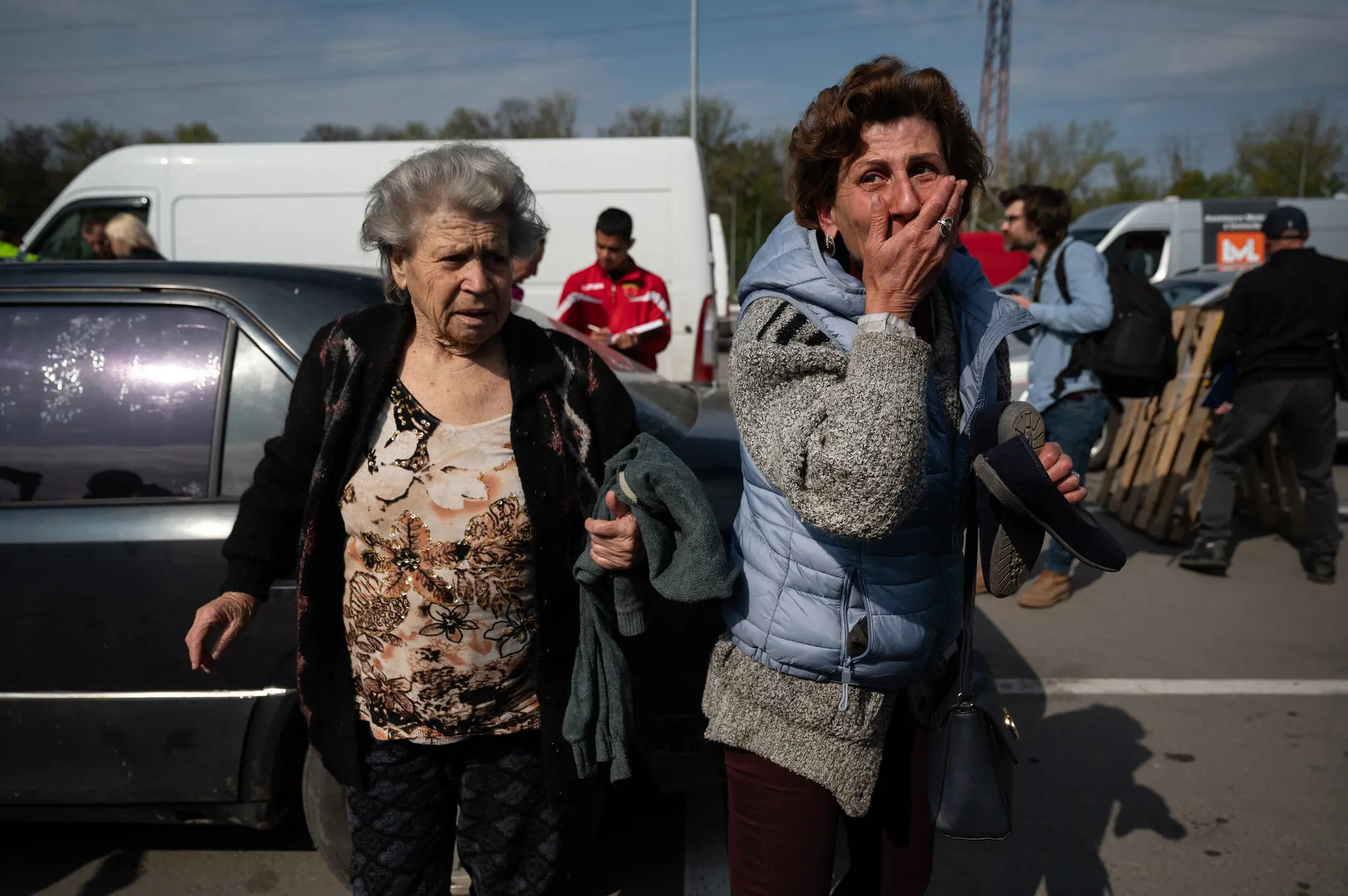 Мати та донька прибувають до Запоріжжя, Україна, у травні 2022 року, після втечі з Маріуполя та навколишніх окупованих сіл. Близько половини довоєнного населення міста, яке становило понад 450 000 осіб, втекло — Лінсі Аддаріо