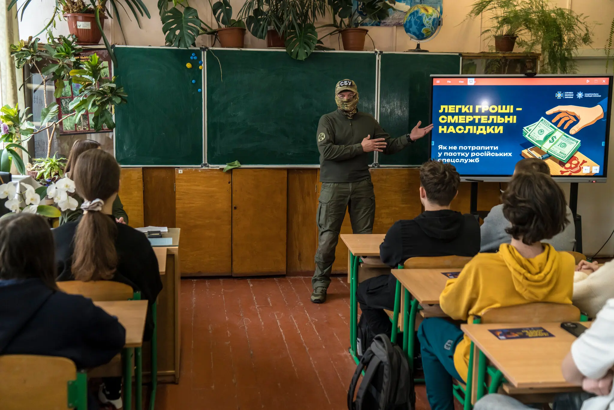 Викладач Служби безпеки України проводить презентацію для учнів 10-го класу середньої школи у Львові, що на заході України, про російські схеми вербування молоді для дрібного саботажу чи шпигунства — Брендан Гоффман