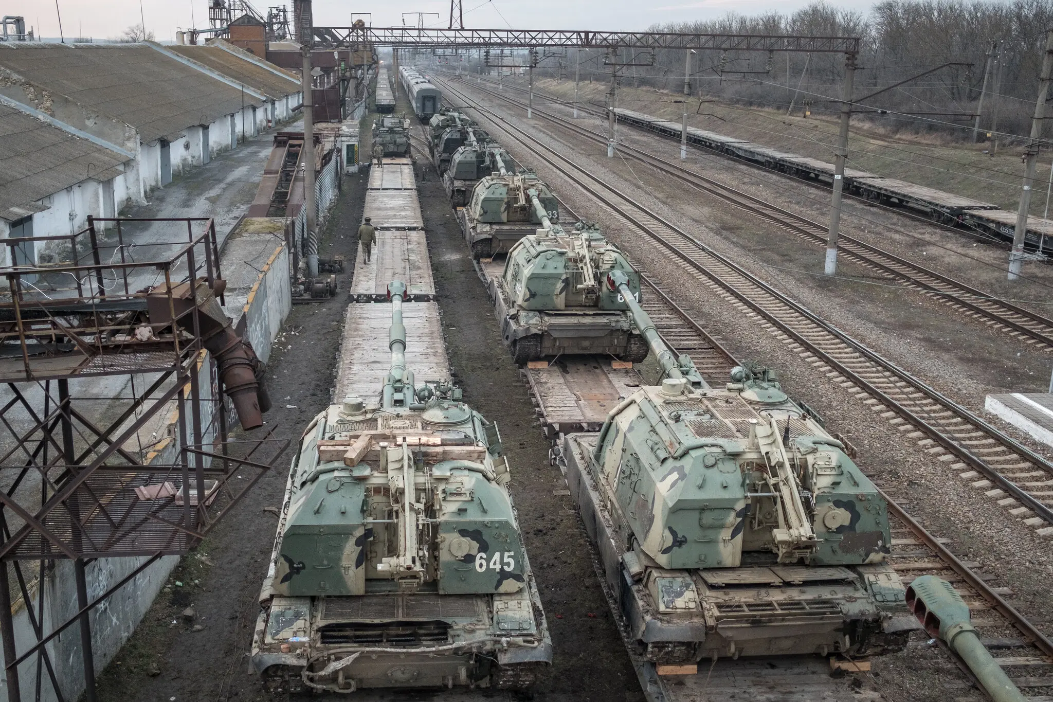 Зброя та військова техніка у поїзді поблизу Таганрога, Росія, у дні, що передували вторгненню в Україну. Після початку війни Кремль прагнув ширшої мілітаризації суспільства — Серез NYT