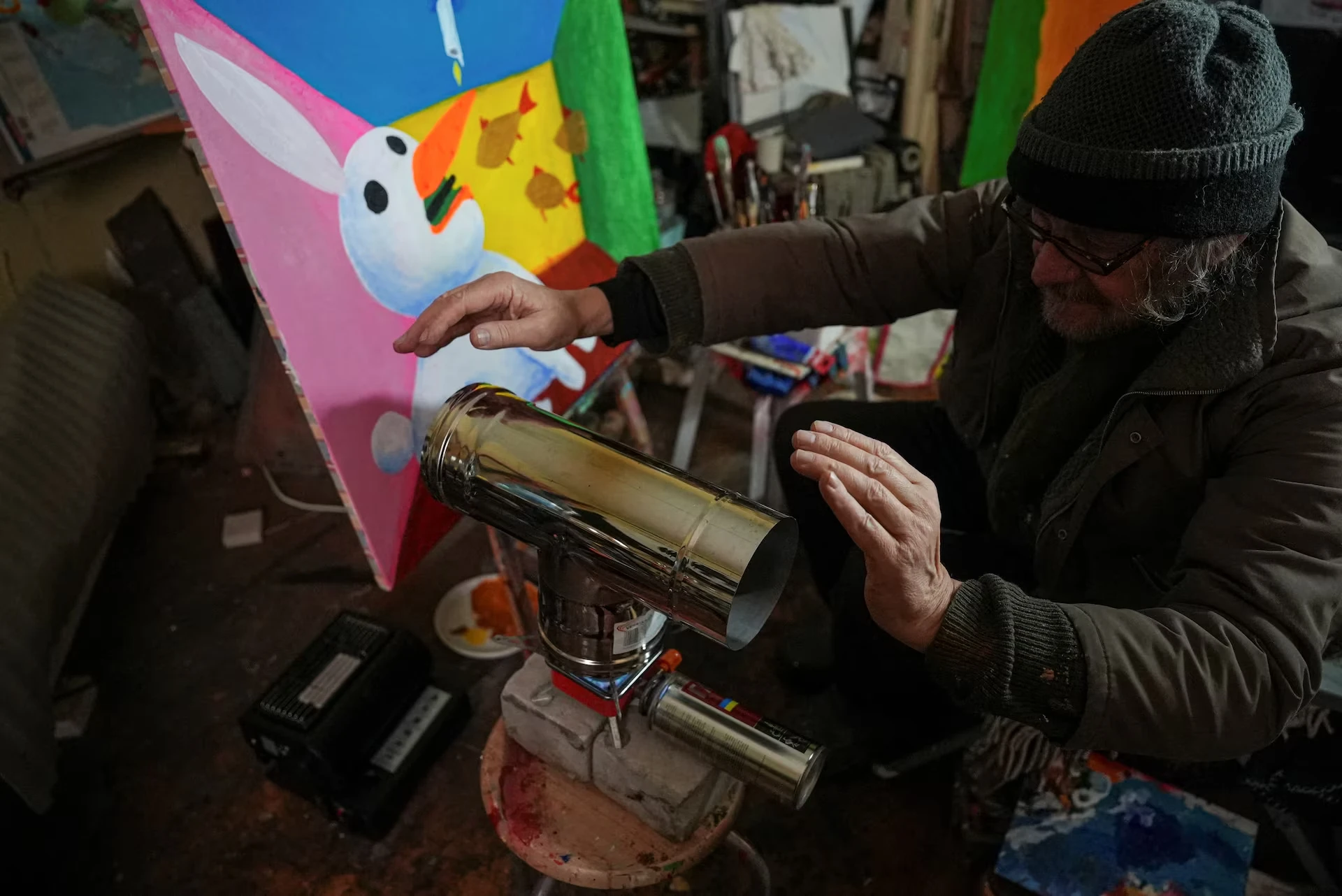 В іншій студії, де працює 70-річний Олександр Ляпін, з рота йде пара. Над головою — свічка, а в кутку — туристичний газовий пальник, на якому гріється чайник. Завдяки цьому температура ледь перевищує нуль.