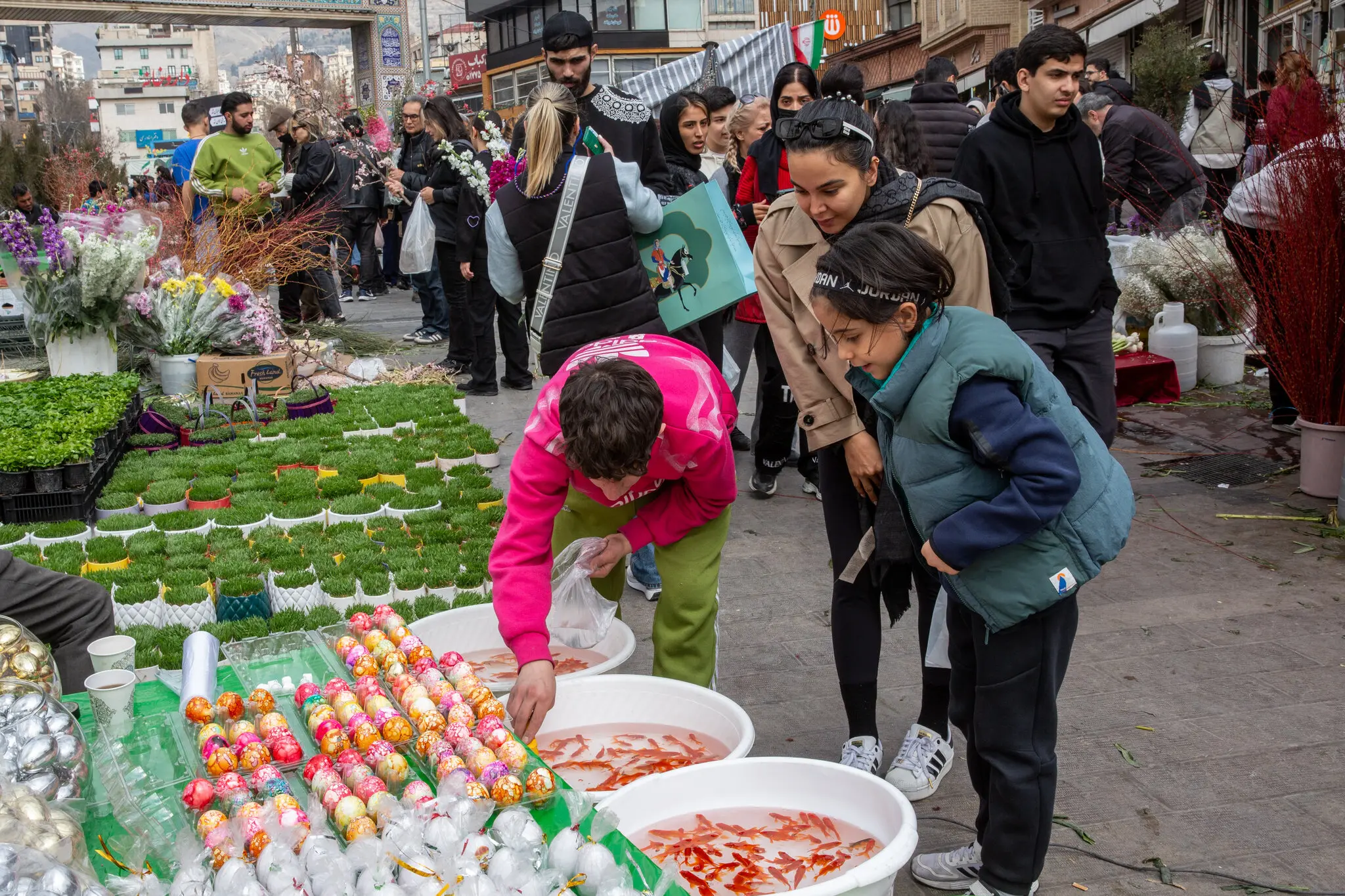 Золоті рибки та фарбовані яйця є одними з традиційних товарів, що продаються на Новруз, але на таких кіосках, як ці, на базарі Таджріш у четвер, немає звичайних натовпів — Дієго Ібарра Санчес