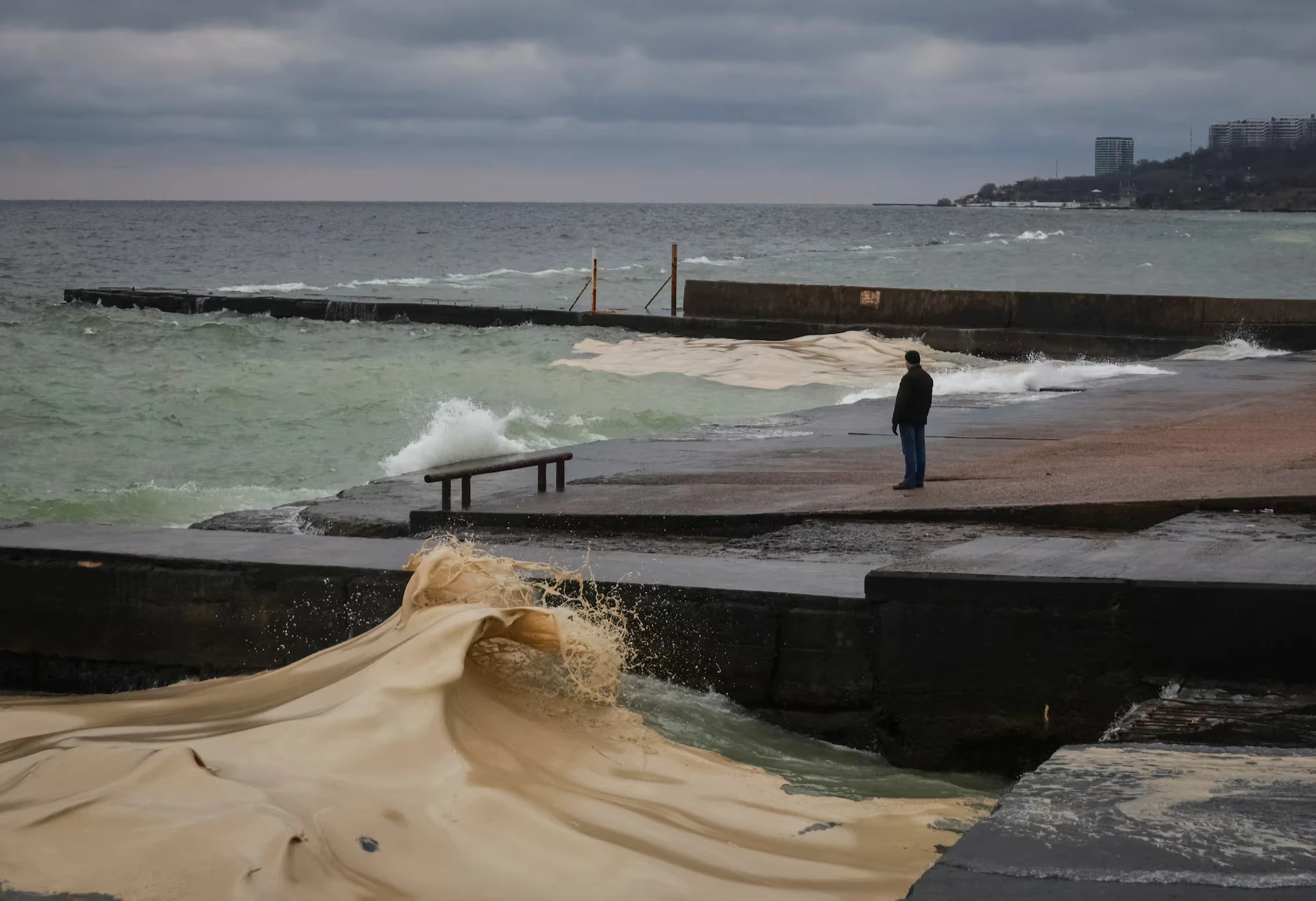 Мешканець стоїть на набережній поблизу місця розливу соняшникової олії з портового терміналу, який був уражений нещодавніми російськими ракетними та дроновими атаками, на тлі російського вторгнення в Україну, в Одесі, Україна, 24 грудня 2025 року — Ніна Ліашонок