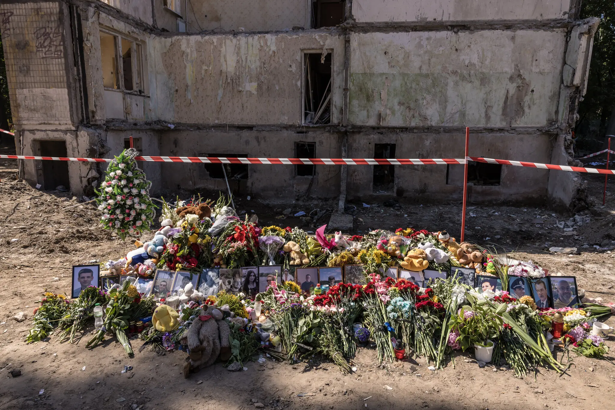 Імпровізований меморіал з квітами, іграшками та портретами загиблих під час обстрілу. — Оксана Парафенюк