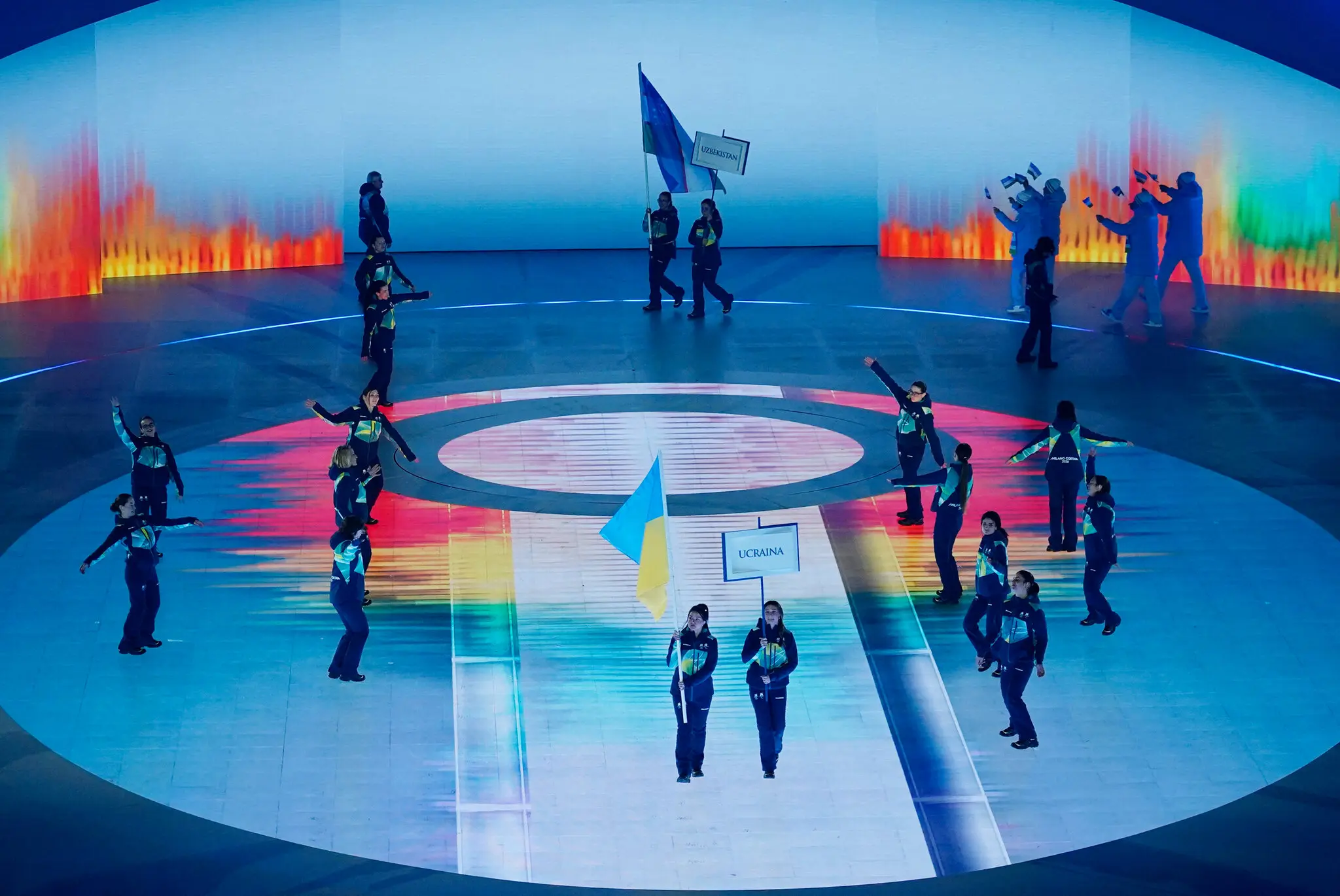 Символічним моментом церемонії стало те, що прапор України на арену винесли місцеві волонтери, адже українські спортсмени вирішили не брати участь у параді делегацій.