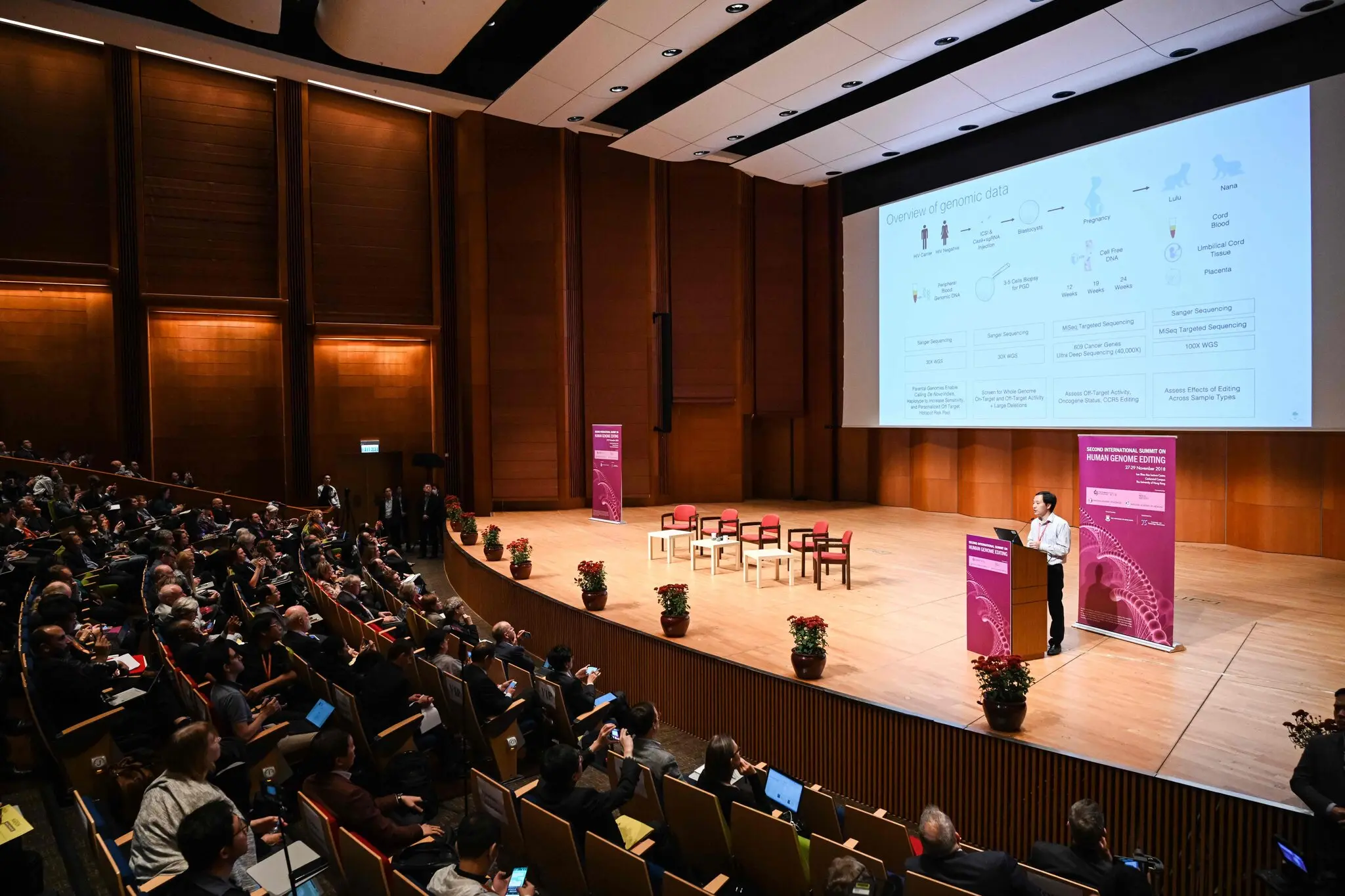 Доктор Хе виступив на міжнародній конференції з редагування геному людини в Гонконзі у 2018 році. Критики звинуватили його в порушенні медичної етики, що він відкидає як ознаку застою Заходу — Ентоні Воллес
