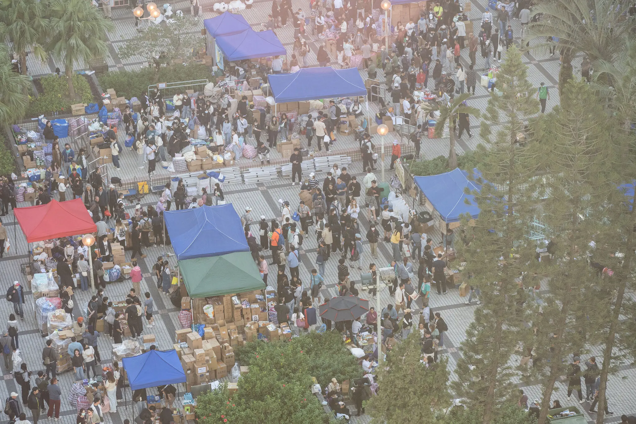 Волонтери сортують пожертвований одяг та їжу у суді Ван Фук у Тай По — Лам Їк Фей