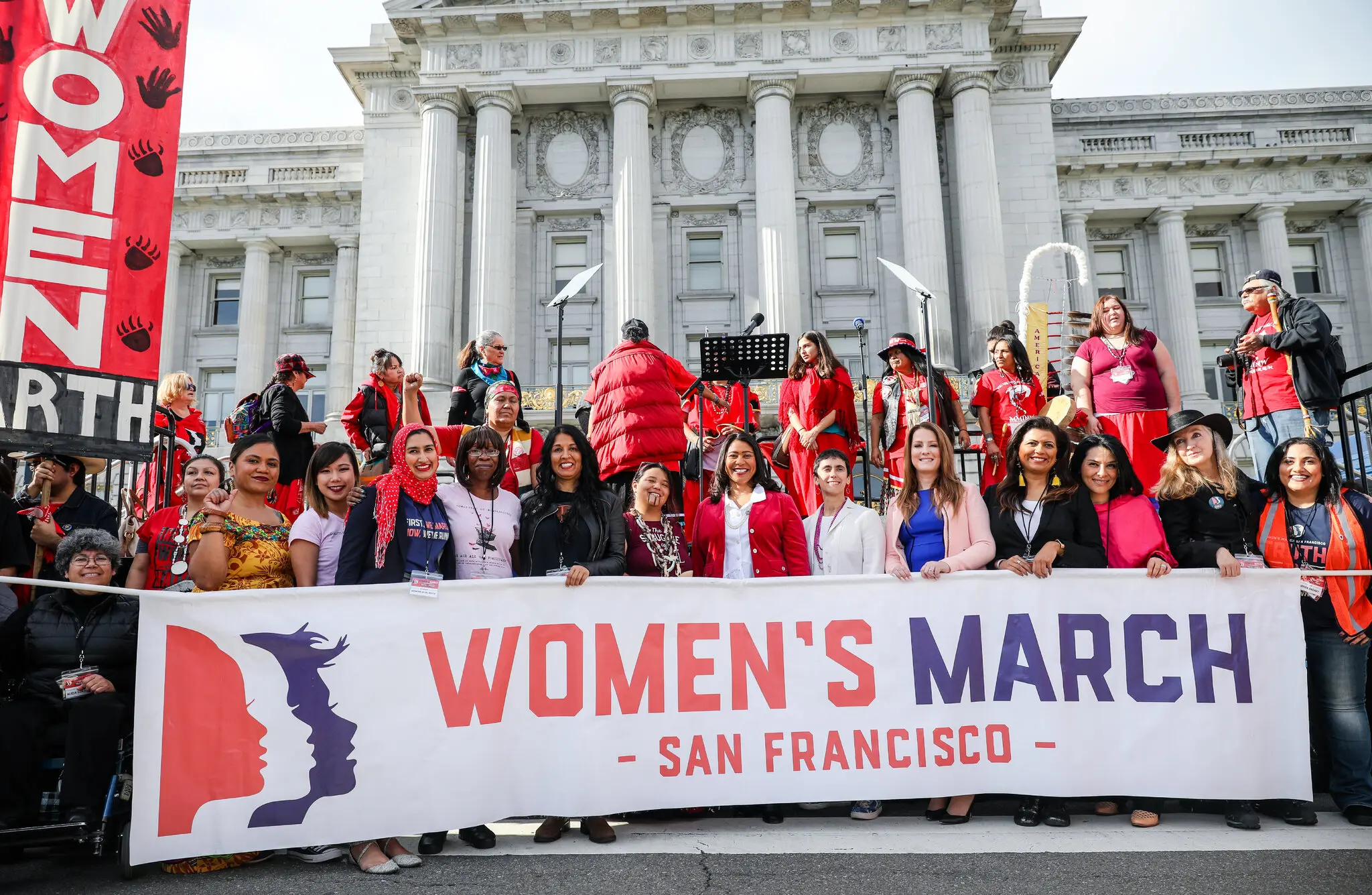 Солніт (друга праворуч) та інші демонстрантки перед будівлею мерії під час Жіночого маршу Сан-Франциско у 2019 році — Келлі Салліван