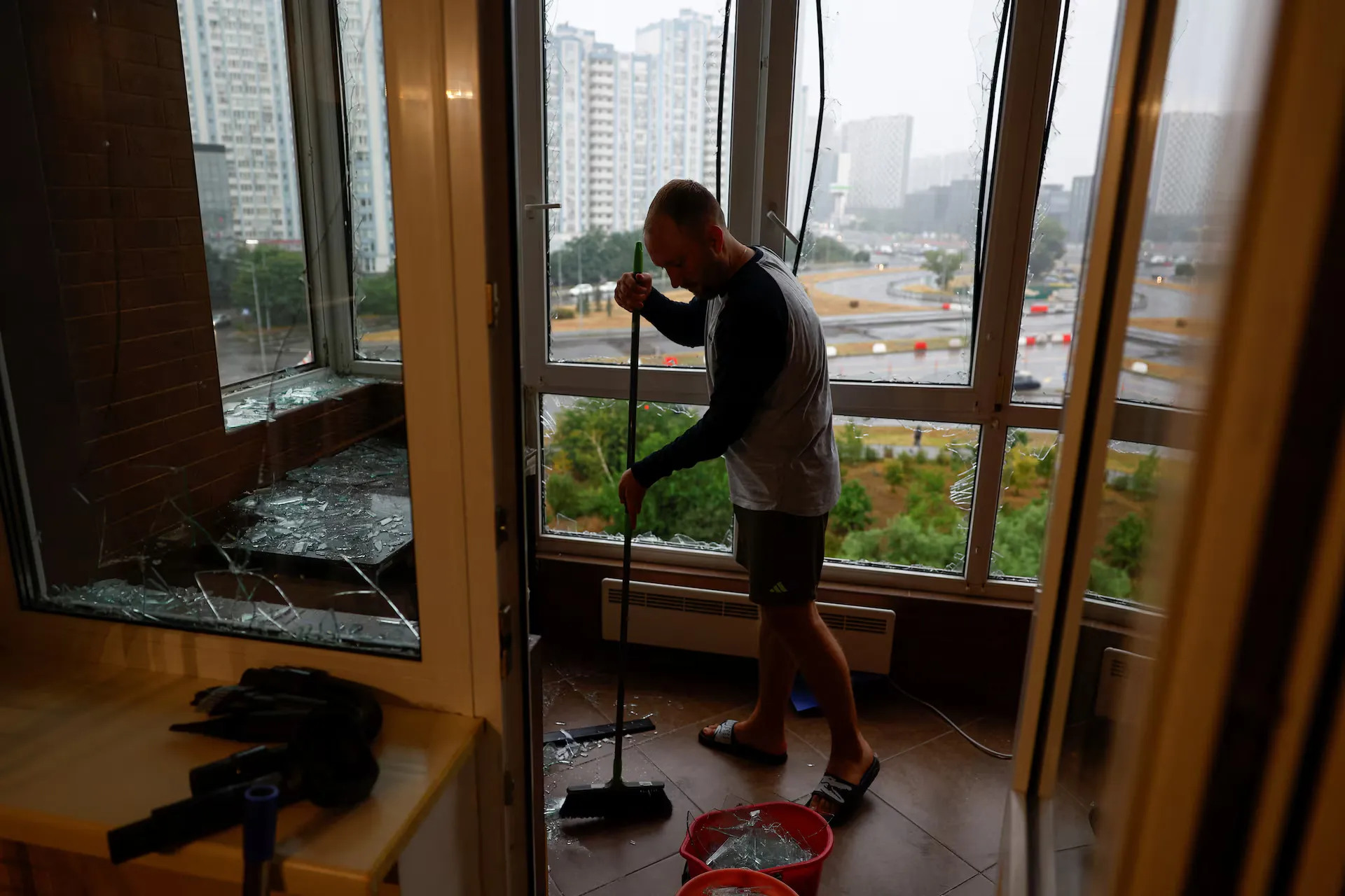 Вадим прибирає уламки зсередини своєї квартири, пошкоджені під час удару російського безпілотника на тлі нападу Росії на Україну, у Києві, Україна, 28 липня 2025 року — Валентин Огіренко
