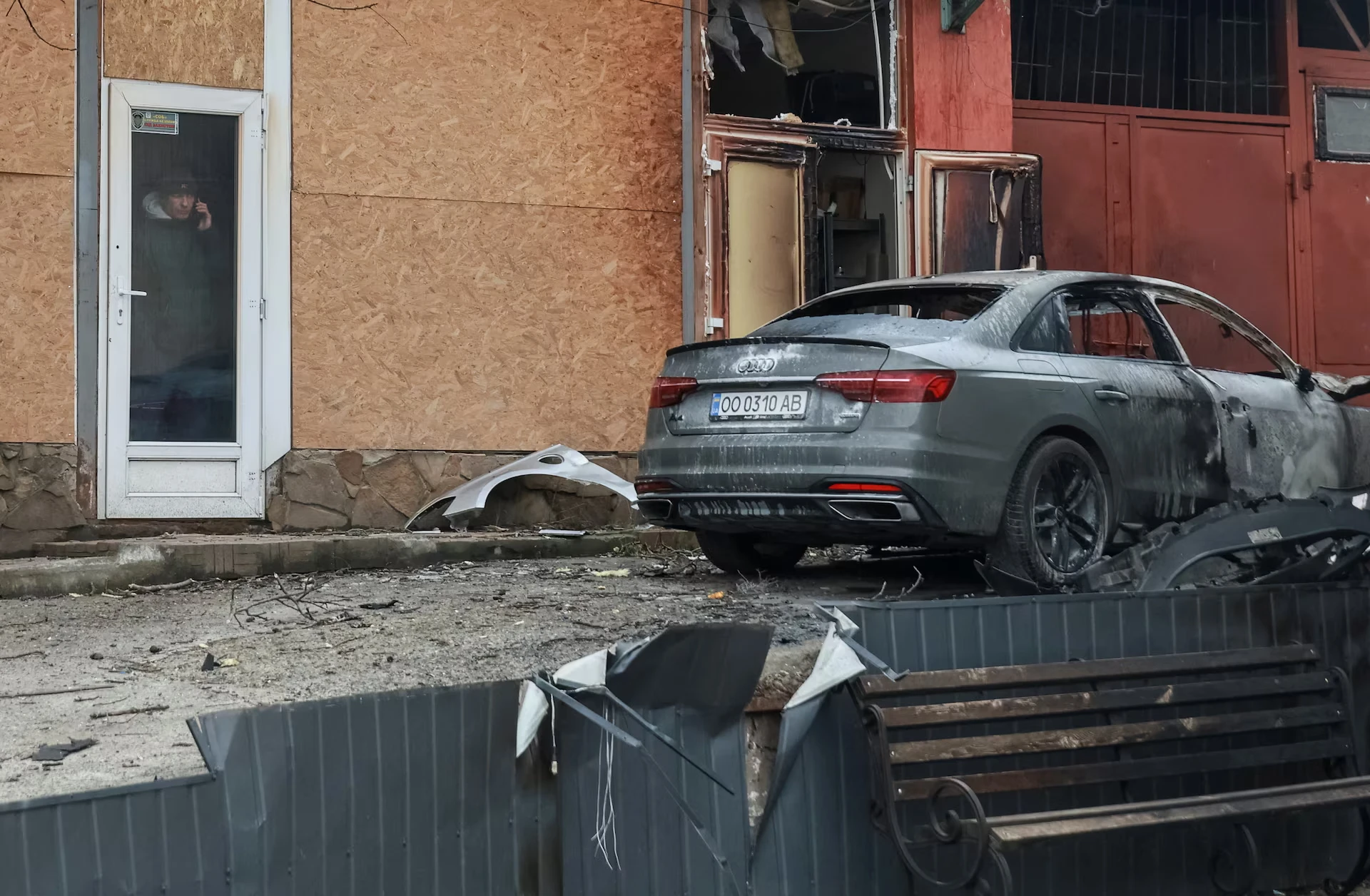 Мешканець дивиться на пошкоджений автомобіль на місці удару російського безпілотника на тлі нападу Росії на Україну в Одесі, Україна, 17 лютого 2026 року — Ніна Ляшонок