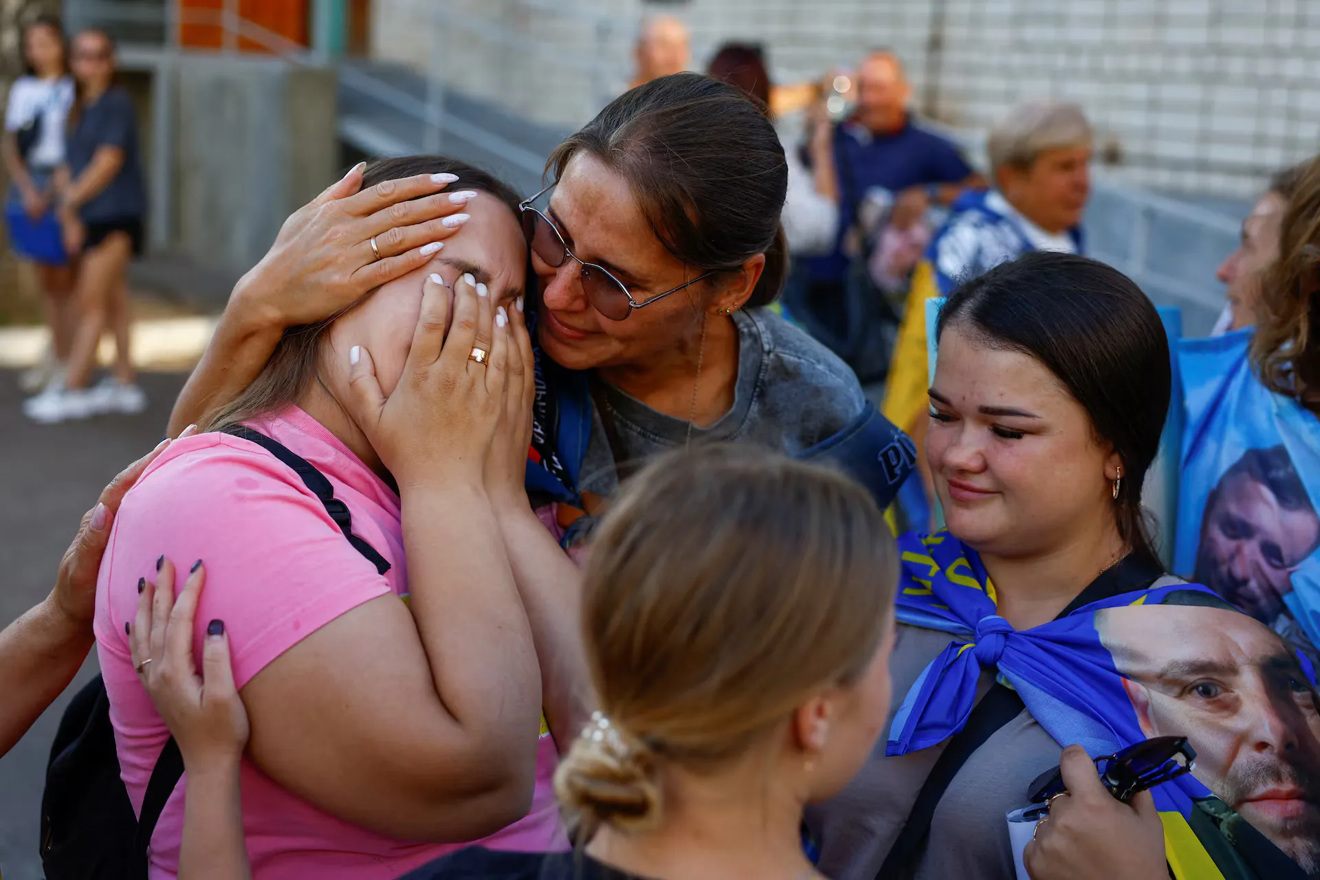 Жінка реагує на повідомлення звільнених українських військовополонених про те, що її родич живий і залишається в російському полоні, на тлі російського нападу на Україну, в невідомому місці в Україні, 14 серпня 2025 року — Валентин Огіренко